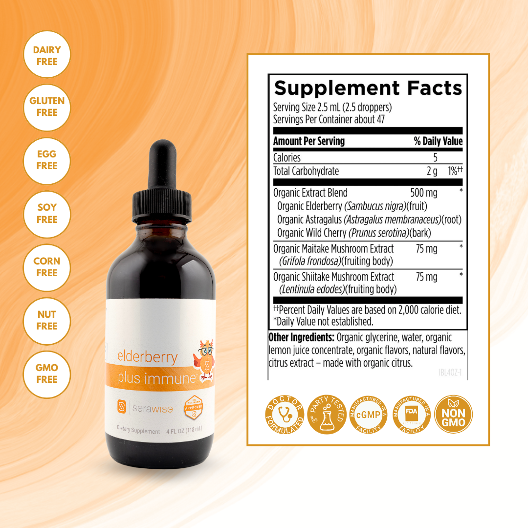 Elderberry Plus Immune provides robust immune support in a pleasant-tasting liquid. Research suggests that certain herbs, mushrooms, and other natural compounds can support normal immune functions, including natural killer (NK) cell activity, cytokine synthesis, and T-cell and B-cell responses. This product is designed to enhance overall immunity and help manage conditions like eczema.